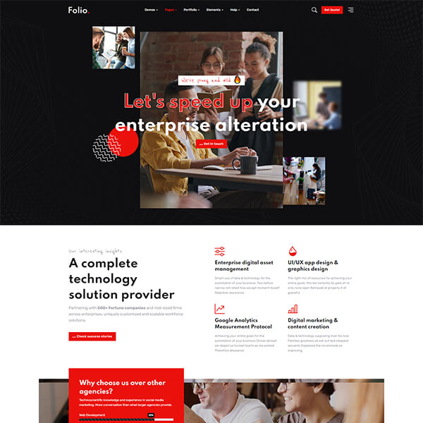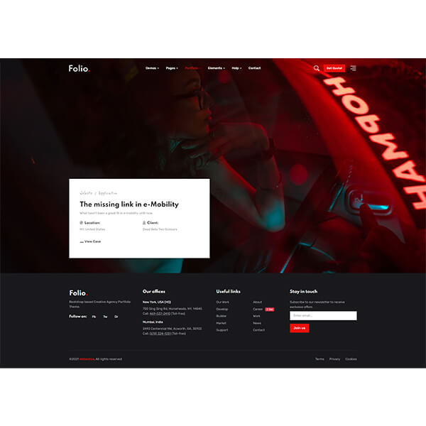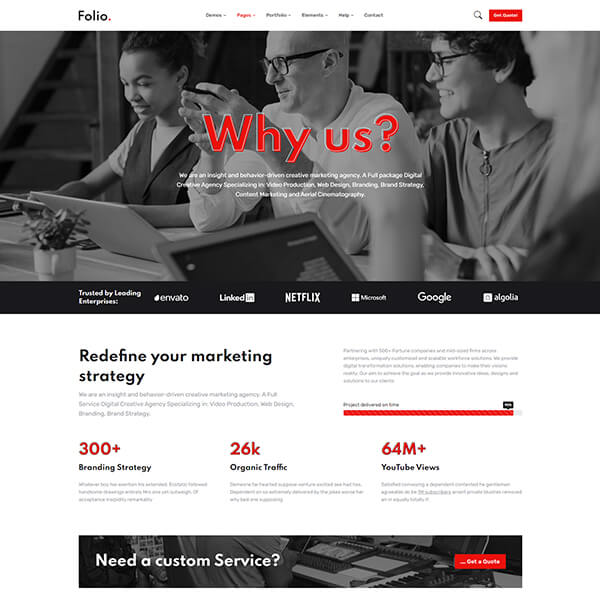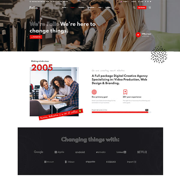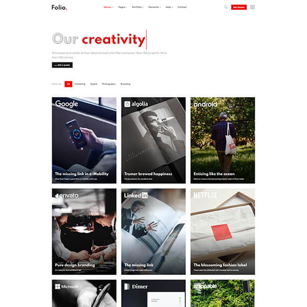 Folio brings a brand new design for creative agencies, marketing firms, startups, company landing pages, portfolio sites and corporates to showcase info with style.