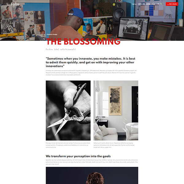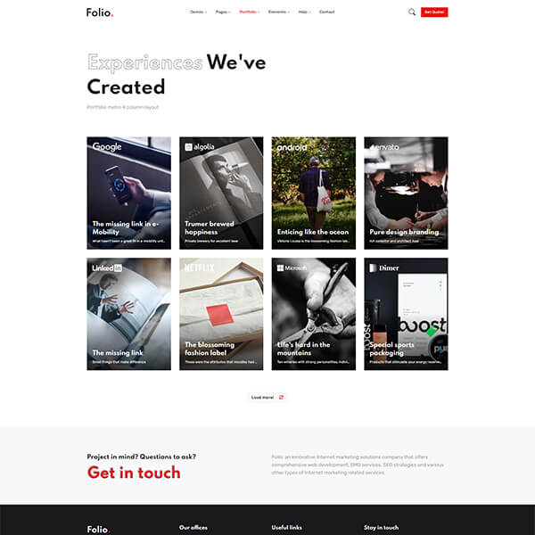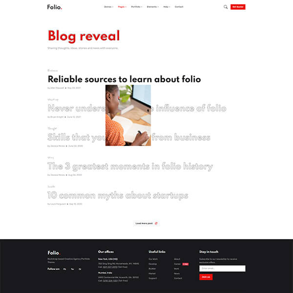 Skillful use of web animations can engage and hold user's attention longer than just ordinary text-based webpage and may result in getting more traffic and quality leads. In Folio, We have provided scroll animations, hover animations, reveal animations and page load animations to make web pages look alive and attractive.