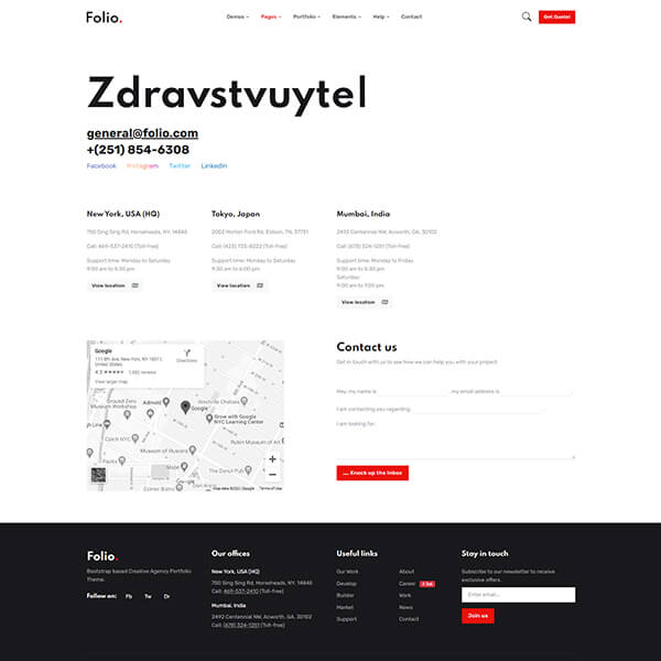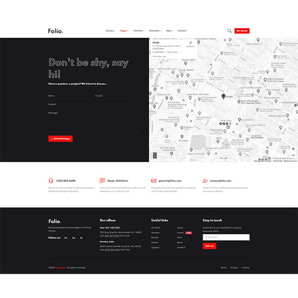 Being reachable is critical when you’re trying to connect with your customers/particular audience. Put up a contact form instead of just providing an e-mail address is a lot easier for website users. And to make this easy for you, we have provided a working contact form with Folio. There should not be anything tricky for you to setup the form so you just need to replace recipient e-mail ID and yay it's done.